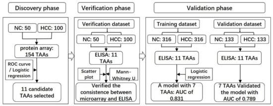 The T7-phase display system [24], recombinant cDNA expression library (SEREX) [25], and Serological Proteome Analysis (SERPA) [26,27,28] have been performed in previous studies to screen TAAs for the diagnosis of HCC. However, these methods not only have tedious steps and strict technical requirements for operators but also have relatively high false positive rates. Therefore, a growing number of studies focused on protein microarrays to screen TAAs in a single experiment and have facilitated the rapid and efficient identification of novel biomarkers [29,30]. Hepatocarcinogenesis is a complex multistep process involving many altered signaling cascades, and the most important change in this process is the mutation of cancer driver genes [31]. It has been hypothesized that the proteins encoded by cancer driver genes might be changed following cancer driver genes’ mutation; accordingly, the corresponding autoantibodies might be produced or have their levels increased. Therefore, in the current study, a customized protein microarray based on cancer driver genes was applied to screen TAAs with sera from 100 HCC patients and 50 normal controls (NCs). After verification with ELISA in the same set of samples, another 898 samples, divided into a training dataset and validation dataset, were also tested by ELISA to evaluate the potential of anti-TAA autoantibodies as noninvasive biomarkers for the detection of HCC.