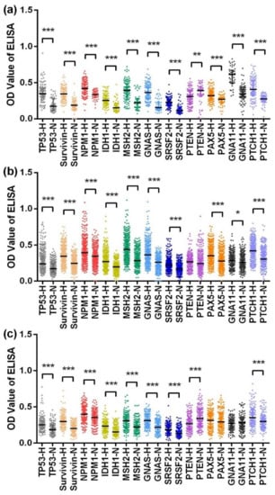 Autoantibodies against 11 TAAs were detected by ELISA. The 11 purified recombinant proteins were diluted in coating buffer at optimal concentrations (TP53, survivin, MSH2, GNAS, PTEN, PAX5, GNA11, PTCH1, IDH1, SRSF2, and NPM1 at final concentrations of 0.5, 0.5, 0.25, 0.25, 0.25, 0.25, 0.5, 0.5, 0.125, 0.125, and 0.125 µg/mL, respectively). The other details were described previously [20,47]. All cancer and normal samples were interspersed on the plates, and 8 fixed human serum samples and 2 blank controls were run on each plate. The mean value of the 8 samples was used to normalize the different plates, and the blank controls were consulted for quality control for individual plates.