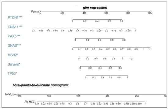 Nomogram for predicting the probability of HCC. As an example, locate the patient’s OD value of anti-PTCH autoantibody and draw a line straight up to the “points” axis to determine the score associated with this indicator. Add the scores achieved for each anti-TAA autoantibody, and locate this sum on the “total points” axis. Draw a line straight down to determine the probability of HCC. *** p < 0.001, * p < 0.05. Pr (HCC), probability of HCC.