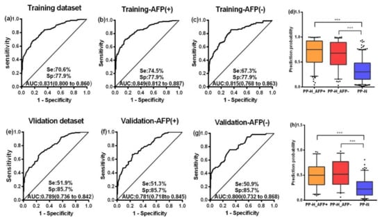 ROC curves of the PP value in the training dataset (a), validation dataset (e), AFP (+) group and AFP (−) group of the training dataset (b,c), and those of the validation dataset (f,g). Box plots present the levels of the PP value among the AFP (+) group and AFP (−) group and NC group in the training dataset (d) and validation dataset (h). Se, sensitivity; Sp, specificity; AUC, area under the receiver operating characteristic curve, 95%CI of AUC in brackets. PP, the prediction probability of logistic regression for HCC; H, hepatocellular carcinoma. Lines on boxes are in the order of 95, 75, 50, 25 and 5 quantiles from top to bottom; Whiskers indicate points greater than 95% quantile and less than 5% quantile; *** p < 0.001.