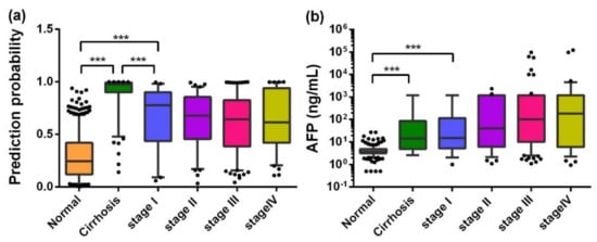 Box plots of PP (a) and AFP (b) in different stages in the development of HCC. Lines on the boxes are in the order of 95, 75, 50, 25, and 5 quantiles from top to bottom; Whiskers indicate points greater than the 95% quantile and less than 5% quantile; *** p < 0.001.