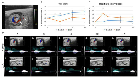 Figure 1. Blood flow in the umbilical cord. (A) On day E12.5 of pregnancy, an umbilical cord artery of one embryo was viewed by Color Doppler mode; presentation of an embryo (*) with its adjacent placenta (**) and the umbilical cord (arrows) in which the acquisition was taken. Following a short stabilization period, a baseline arterial blood flow was recorded and quantified. Then, mice were injected with either doxorubicin (DXR; 8 mg/kg, n = 7, n = number of imaged arteries, one embryo per pregnant mouse) or saline (control; n = 6). The arterial blood flow was monitored continuously by pulse-wave (PW) Doppler mode for 15 min, recorded and analyzed at various time points post injection by analyzing the (B) velocity time integral (VTI); and (C) heart rate interval. (D) Representative PW Doppler photos of the analyzed time points. Analysis of each PW Doppler cine loop was performed. Values of post-treatment imaging were normalized according to pretreatment imaging values of each mouse (defined as 100%). Saline-injected mice were standardized to 100% as a reference to DXR-injected mice. Data are expressed as mean ± standard error of mean (SEM). Individual comparisons were made using a Student’s t-test. (*) P value of 0.05 was considered statistically significant.