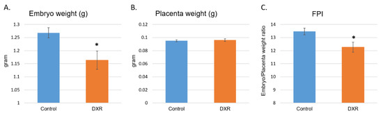 The entire embryonic sacs were removed from the DXR- and saline-treated pregnant mice on day E18.5, embryos were separated from the placentae and both were weighed (Table S1). A significant decrease in the weight of the DXR-exposed embryos was observed as compared with that of the control embryos (Figure 2A, mean weight of 1.163 g and 1.268 g, respectively, 8.2% difference). Unlike the embryos, the weights of the placentae in both treatment groups were the same (Figure 2B). The fetal to placenta weight ratio index (FPI), which represents placental efficiency [21], was significantly reduced in the DXR-injected mice as well (Figure 2B, 8.9% difference).
