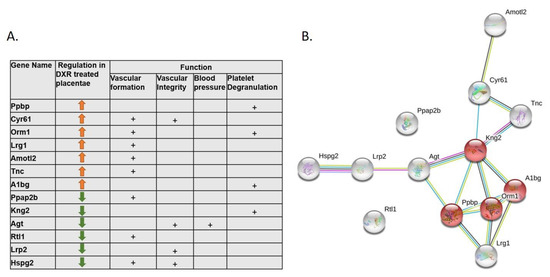 Proteomic analysis of mice placentae revealed a significant change in the expression of 277 proteins upon exposure to DXR (Table S2). Thirteen of them are involved with vascular changes and the related placental toxicity; some of them participate in the platelet degranulation pathway, thereby contributing to increased procoagulant activity (Kng2, A1bg, Ppbp, Orm1; Reactome pathway MMU-114608) or to regulation of neo-vascular formation, vascular-wall integrity, and blood pressure (Cyr61, Lrg1, Amotl2, Tnc, Ppap2b, Agt, Lrp2, Rtl1, and Hspg2) (Figure 3A,B).