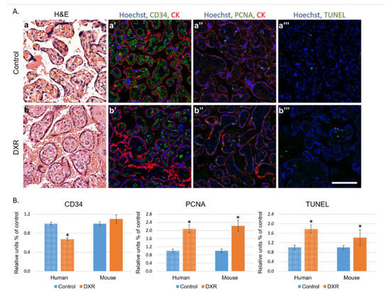 Figure 4. Histology of placentae. (A) Human placentae from women diagnosed with breast cancer during pregnancy (week 27–35) and treated with EPI (n = 7) were compared with human placentae from chemo-naïve women (control n = 10). Representative pictures of control- (a–a‴) or EPI-exposed (b–b‴) human placenta, stained for the following: H&E (a,b); CD34 (neovascularization a′,b′); PCNA (proliferating cell nuclear antigen; a″,b″); pan-cytokeratin (positive control for staining; CK a′,a″,b′,b″); or TUNEL (apoptosis a‴,b‴). Florescence images were photographed using a LSM-510 confocal laser-scanning microscope. Offset calibration of the photomultiplier was performed with sections stained with secondary antibodies only. Bar = 100 µm. (B) Florescence pattern was imaged in human and in dissections of placentae from pregnant female mice treated with either DXR (n = 52, from 4 pregnant mice) or saline (n = 21, from 4 pregnant mice). The average number of PCNA positive cells, TUNEL positive cells, or CD34 blood vessels were automatically analyzed by FIJI software, and compared with control samples (defined as 1). Data are expressed as mean ± SEM. Individual comparisons were made using a Student’s t-test. (*) P value of 0.05 was considered statistically significant.