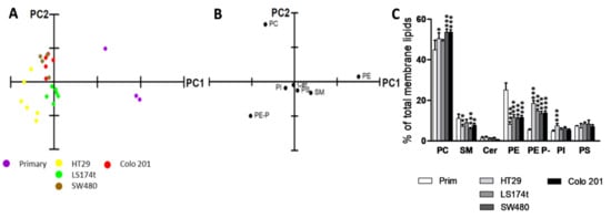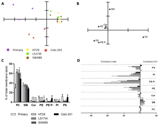 EV lipid analysis was sensitive enough to separate them according to their cell origin. Thus, PCA of membrane lipid classes separated primary and cancer cell-derived EVs, although, unlike for cells, it was not able to discriminate between the in situ and Colo 201 cancer cells (Figure 6A).
