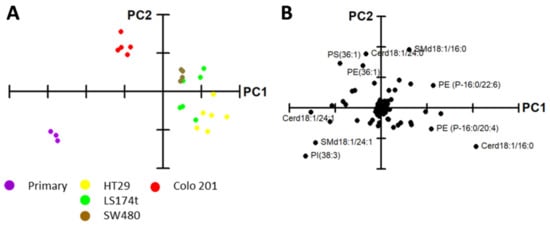 To delve into these differences, a PCA was performed using all molecular lipid species detected (Figure 2). The results confirmed the capacity of the whole lipidome to separate the cell lines into three groups according to their malignancy; that is, primary cells (Prim) from in situ (HT29, SW480, and LS174t) and from highly metastatic cancer cells (Colo 201) (Figure 2A). Higher levels in PI38:3, SMd18:1/24:1, and Cerd18:1/24:1, and lower levels in PE P-16:0/22:6 and SMd18:1/16:0 accounted for the separation of the primary cells (Figure 2B). Colo 201 were separated from the in situ cells because of the higher content in PS and PE36:1, SMd18:1/16:0, and Cer18:1/24:0, and the lower content in Cer18:1/16:0 and 18:1/24:1 and PE P-16:0/20:4. Despite the fact that PCA was able to discriminate between the cell lines, it barely explained 50.0% of sample variance. Hence, to identify the lipid species accounting for the separation, each lipid class was analyzed individually by PCA (Figure S1). Briefly, the molecular species of each lipid class separately were able to differentiate, to a greater or lesser extent, primary cells from cancer cells. However, only PC, PE plasmalogens, and PS molecular species were able to separate Colo 201 from the rest of the cell lines.