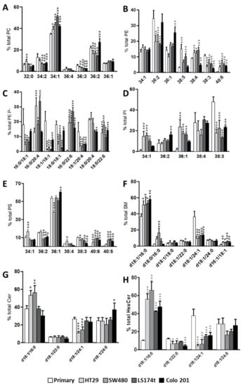 Membrane lipid fingerprint of primary, in situ, and metastatic cancer cell lines. Bar diagrams comparing changes in lipid composition of (A) PC, (B) PE, (C) PE plasmalogens, (D) PI, (E) PS, (F) SM, (G) Cer, and (H) HexCer at the molecular species level in primary, HT29, LS174t, SW480, and Colo 201 cell lines. Values are expressed as percentage of total fatty acid (mole %) and represent mean ± SD, n = 3–6. Statistical significance was assessed using one-way ANOVA followed by Bonferroni post-test. For clarity, only significance with respect to primary cells are expressed, * p < 0.05; ** p < 0.01; *** p < 0.001; and only species accounting for <5% of total membrane lipid class are included in the graph. Detailed results of all comparisons and all lipid species are included in Table S2.