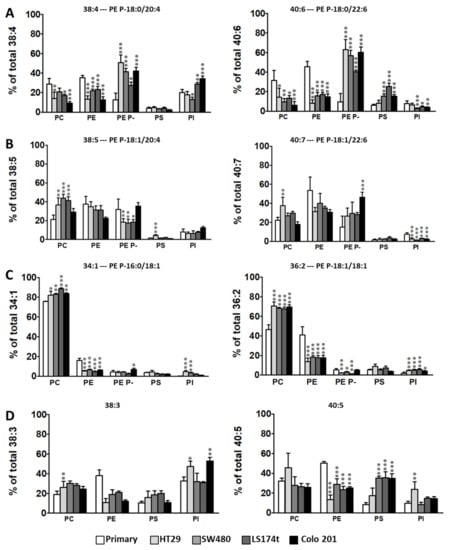 Consistent with data in human colon epithelium [8], the most abundant PC species in all cell lines was 34:1 (34.6–50.9%, lowest and highest value throughout the five cell lines analyzed, respectively), followed by 36:2 (13.9–27.3%), 34:2 (6.8–13.1%), and 36:1 (7.4–9.2%). Within this lipid class, we detected an increase in 34:1 (34.6 vs. 44.0%, primary vs. the average value in cancer cells), and a decrease in 36:3 (5.4 vs. 3.3%) and in 36:2 (21.8 vs. 11,9%), except for Colo 201 that increased up to 27.3% (Figure 3A, Table S2).