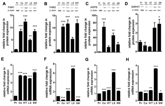 Protein and gene expression of ether lipid synthetic enzymes in primary and cancer colon cell lines. (A–D) Protein expression of ether lipid synthesis enzymes: FAR1 and FAR2 (fatty acyl-CoA reductases 1 and 2), AGPS (alkyl-glycerone-3-phosphate synthase), and GNPAT (glyceronephosphate O-acyltransferase) in primary (Pr) and cancer colon cell lines (Co, Colo-201; HT, HT29; LS, LS174T; SW, SW480). Values are expressed as a percentage of control and represent the mean ± SEM, n = 3–5; (E–H) Gene expression of ether lipid synthesis enzymes in primary (Pr) and cancer colon cell lines (Co, Colo-201; HT, HT29; LS, LS174T; SW, SW480). Values are expressed as a percentage of control and represent the mean ± SEM, n = 5. To assess statistical differences, one-way ANOVA and Bonferroni post-test were applied. For simplicity only significance with respect to primary cells are expressed. * p < 0.05; ** p < 0.01; *** p < 0.001. Detailed results of all comparisons are included in Table S5. Original values and densitometry values are included in Figure S4 and Table S4, respectively.