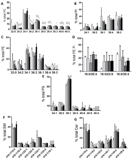 Next, we evaluated how a particular molecular species, expressed as the number of C-atoms: number of double bonds (38:1, 38:4, 40:5, etc.), were distributed within the main membrane phospholipid classes (PC, PE, PE plasmalogens, PS, and PI) (Figure 4, Figure S2, Table S3). By doing so, we were able to evaluate into which phospholipid class cells channeled and stored a particular combination of fatty acids. At this point, we need to acknowledge that, except for PE plasmalogens, our lipidomic data did not provide the identity of each of the fatty acid moieties. Therefore, we had to assume certain assignations. To do this, we took into account the combination of fatty acids identified in PE plasmalogens, as well as data found in the literature. Nevertheless, alternative combinations of fatty acids contributing to the final percentage cannot be ruled out.