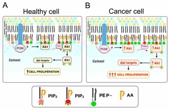 Model describing the impact of the most consistent lipid changes observed in cancer cells—increase in PE plasmalogen- and AA-containing phospholipids (in particular PI)—on the Akt signaling pathway, a canonical cell differentiation and proliferation pathway. (A) In healthy cells, phosphatidylinositol-3–kinase (PI3K) phosphorylates PIP2 to PIP3, which recruits Akt directly via a PH-pleckstrin domain. Despite the lack of direct evidence indicating the preference of PI3K enzymatic for AA-containing PIP2, this specificity was shown for PI4K [68,69]; in addition, both PIP2 and PIP3 are enriched in AA [70]. Altogether, it could be speculated that PI3K, may prefer AA-containing substrates. Thus, other papers show that plasmalogens are needed to maintain Akt linked to the membrane [67,71], which is crucial for its activation via phosphorylation by PDK1 and PDK2 (among others). Once phosphorylated, Akt shuttles back to the cytosol where it phosphorylates a myriad of targets, activating downstream pathways that culminate in cell proliferation. (B)—In cancer cells, including colorectal cancer cells, PI3K and Akt are overexpressed at the protein level [72]. Therefore, the presence of high levels of AA-containing phospholipid, and plasmalogen [8,15,45,46,47] in cancer cells would provide the substrate and necessary environment to sustain enhanced and uncontrolled cell division.