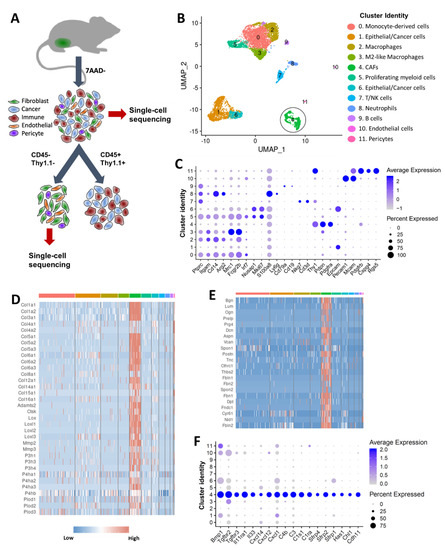 2.1. scRNA-seq Reveals Transcriptional Profiles of CAFs in Murine Mammary Tumors