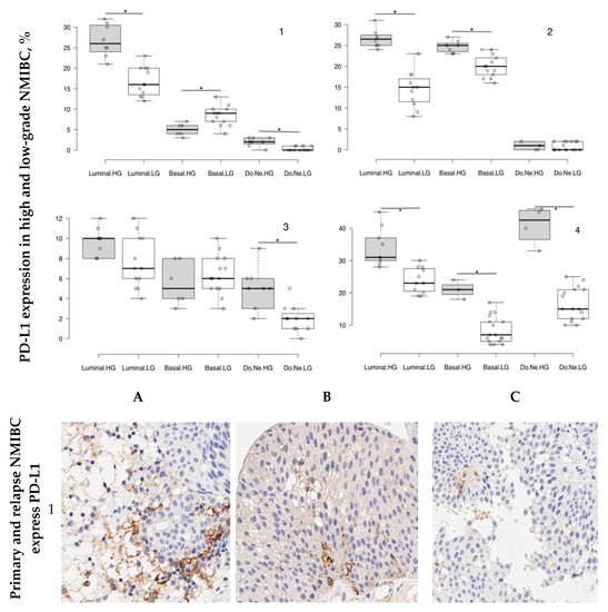 PD-L1 expression in primary and recurrent NMIBC. Boxplots show Medians of percentage of anti-PD-L1 positively stained cells in high-grade (HG) and low-grade (LG) primary (1), relapsed untreated (2), relapsed mitomycin-treated (3) and Bacillus Calmette–Guerin (BCG)-utilized (4) tumor specimens of luminal molecular subtype of bladder cancer (A); basal subtype of urothelial carcinoma (B) and double-negative (Do.Ne.) p53-expressing NMIBC (C): *—p < 0.05, intergroup comparison between HG and LG tumors of the same molecular subtype, independent t-test. Microphotographs of anti-PD-L1-stained tumor sections, IHC, ×500.
