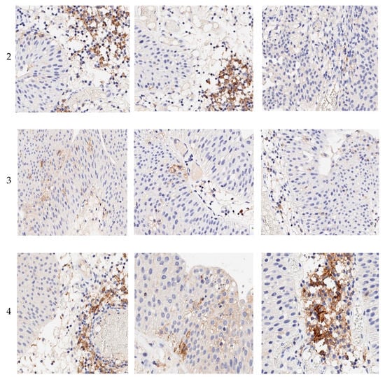 As it has been reported, tumor microenvironment is broadly involved in cancer development and progression [14,15,16,17,18]. In relation to the subject of our study, tumor-infiltrating immune cells in urothelial cancers can express PD-L1 exhibiting immune downregulation, which should be taken into consideration when assessing what kind of cells—malignant or stromal—expresses PD-L1. Therefore, we assessed the level of T-suppressor population in each of the study groups (Figure 2).