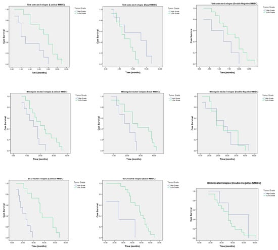 In the group of patients that utilized intravesical mitomycin after TUR, the emerging time of high-grade luminal relapsed tumor was lower than the time to low-malignant urothelial cancer recurrence. In the case of high-grade basal NMIBC, relapse-free survival was lower in comparison with low-grade tumors. Survival time to double-negative p53 mutant NMIBC recurrence was not associated with the tumor grade. According to long-rank test, there was significant evidence of a difference in relapse times in luminal and basal NMIBC for low- and high-grade relapsed carcinomas (p < 0.05).