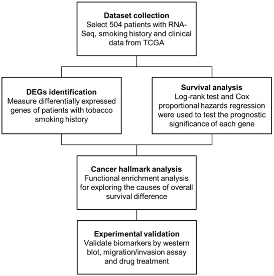 Main flowchart for identifying smoking-related biomarkers and repurposing drugs in head and neck squamous cell carcinoma (HNSCC). In total, 504 HNSCC patients, whose data included mRNA expression (RNA-Seq) data and clinical data (e.g., smoking history, survival state, and follow-up time), were selected from the The Cancer Genome Atlas (TCGA). Then, the differentially expressed genes were identified and survival analysis was investigated to determine the clinical outcome of smoking patients. Third, the enrichment analysis of cancer hallmarks was examined to understand the causes of poor prognosis in smoking patients. Finally, two HNSCC cell lines were utilized to validate gene candidates and drugs for their therapeutic potential.