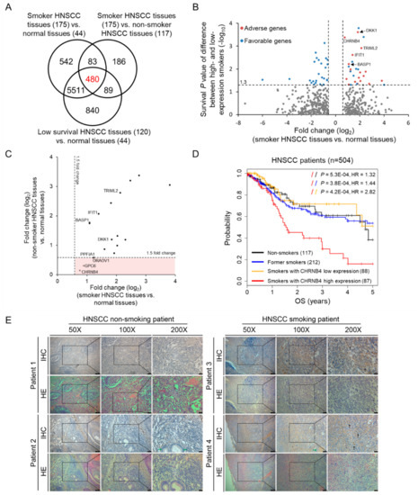 The strategies for determining HNSCC smoking-related and prognostic biomarkers. (A) Venn diagram of differentially expressed genes (DEGs) among normal samples, and HNSCC samples from smoking, non-smoking, and low-survival patients. (B) Identification of 18 adverse (red) and 36 favourable (blue) prognostic genes from 480 DEGs by survival analysis based on high- and low-expression of each gene. (C) Fold change of 18 adverse genes comparing smoker (x-axis) and non-smoker (y-axis) HNSCC tumours to normal tissues. Four genes are located in red region because they are differentially expressed between smoker tumours and normal tissues, but are not between non-smoker tumours and normal tissues. (D) Kaplan–Meier plots of overall survival (OS) of 504 HNSCC patients, including non-smokers (black), former smokers (blue), smokers with low neuronal acetylcholine receptor subunit beta-4 (CHRNB4) expression (orange), and smokers with high CHRNB4 expression (red). (E) Immunohistochemistry stain of clinical HNSCC patients. The tumour region tissue slides from smoking and non-smoking HNSCC patients were stained with CHRNB4 primary antibody, whereas all adjacent sections and same slides were counterstained with haematoxylin and eosin (HE stain) for general histological orientation. Intensive membrane CHRNB4 expression on cancerous region is black arrowed, whereas the CHRNB4 expression in normal adjacent region is indicated by a green arrow.