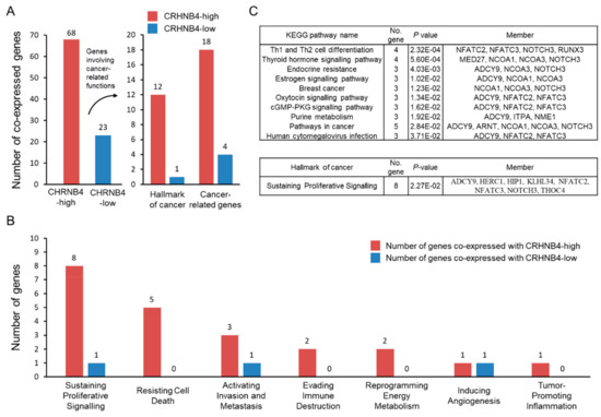 Association between cancer-related functions and CHRNB4 co-expressed genes of CHRNB4-high/low patients. (A) Number of co-expressed genes with CHRNB4 in the CHRNB4-high and -low subgroups involved in cancer hallmark and cancer-related functions. (B) The histogram of co-expressed genes involved in seven cancer hallmarks in CHRNB4-high (red) and CHRNB4-low (blue) smoking patients. (C) Kyoto Encyclopedia of Genes and Genomes (KEGG) pathway and cancer hallmarks enrichment analysis of co-expressed genes in the CHRNB4-high subgroup.