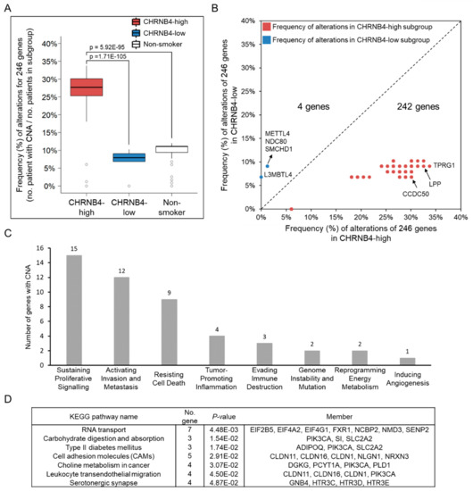 Copy number alterations (CNAs) between the CHRNB4-high and -low subgroups. (A) The boxplots of 246 differential CNAs in CHRNB4-high smoking (red), CHRNB4-low smoking (blue), and non-smoking (white) patients. The two-sided p-value was calculated with Student’s t-test. (B) Scatter plots of CNAs between the CHRNB4-high (x-axis) and CHRNB4-low (y-axis) smoking patients. The genes below the diagonal line indicate that the genes had a higher frequency of genetic alterations in the CHRNB4-high subgroup (red) than in the CHRNB4-low subgroup (blue). (C) The histogram of eight cancer hallmarks of genes with differently frequent CNA between CHRNB4-high and CHRNB4-low subgroups. (D) KEGG pathway enrichment analysis of 246 copy number-altered genes.