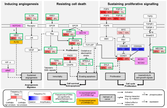 Graphic illustration of the identified genes, functions, and pathways of tumorigenesis in CHRNB4-high and CHRNB4-low subgroups. The key genes, limited number of pathways, and inferred functions for tumorigenesis are based on CHRNB4-high and CHRNB4-low smokers. Subpanels indicate the frequency (%) of copy number alteration (CNA) in CHRNB4-high (left subpanel) and CHRNB4-low subgroups (right subpanel). In each subgroup, the subpanels display the difference (subtraction) of the frequencies between amplification and deletion, and are coloured red if the frequency of amplification is greater than the frequency of deletion, otherwise they are coloured blue. The green border indicates a gene whose CNA frequency between CHRNB4-high and -low subgroups was significantly different (examined by Fisher’s exact test, p < 0.05). Five genes (e.g., NOTCH3, ARNT) are coloured pink, and one gene (FLT4) is orange, representing the genes co-expressed with CHRNB4 in CHRNB4-high and -low subgroups, respectively.