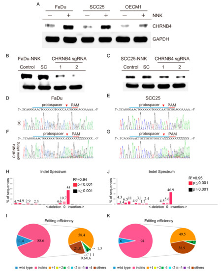 To validate the impact of NNK treatment on CHRNB4, we generated long-term NNK-treated FaDu, SCC25, and OECM1 HNSCC cell lines (Figure 6A). After 1 month of NNK treatment, both FaDu and SCC25 cell lines had significantly higher CHRNB4 protein expressions than the parental controls (without NNK treatment), whereas long-term NNK-treated OECM1 obtained a minor CHRNB4 protein induction compared with the parental control. To understand the tumorigenic role of CHRNB4 during HNSCC development, we performed CRISPR/Cas9 gene editing for CHRNB4 with two independent sgRNAs on both long-term NNK-treated FaDu and SCC25 cells (Figure 6B,C). The CHRNB4 protein expressions of both cell lines were significantly reduced in CHRNB4 sgRNA-1 and sgRNA-2 virus-transfected cells, compared to controls and scramble-sgRNA controls (SC). Then, the CHRNB4 gene loci were Sanger-sequenced, showing clear and single DNA signals on both scramble-sgRNA transfected FaDu (Figure 6D) and SCC25 (Figure 6E) cells. On the other hand, with CHRNB4 sgRNA-2 virus transfection, the CHRNB4 gene sequences were significantly edited, showing the great gene editing efficiency on both FaDu (Figure 6F) and SCC25 (Figure 6G) cells (sgRNA-2 used for further analysis, due to the high gene editing efficiency). Furthermore, to analyse CRISPR-based edit efficiency, Tracking of Indels by Decomposition (TIDE) was used to reveal the insertions and deletions (indels) that induced in FaDu and SCC25 cells with CHRNB4 sgRNA-2 introduction [72]. The result showed the average CHRNB4 gene editing efficiency on FaDu cells was 88.6% (Figure 6H,I), containing 58.4% and 21.8% with single-base insertion and other editing patterns, respectively. On the other hand, CHRNB4 gene editing efficiency on SCC25 cells was 94% (Figure 6J,K), containing 49.5% and 38.9% with single-base insertion and other editing patterns, respectively.