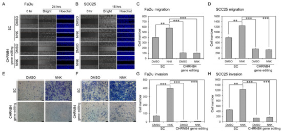 Next, we used cell migration and invasion assays to investigate the tumorigenic role of CHRNB4 on long-term NNK-treated FaDu and SCC25 cells (Figure 7 and Data S5), compared to cells without NNK treatment. Both FaDu (Figure 7A,C) and SCC25 (Figure 7B,D) cell lines displayed significantly higher migration ability of 1.45-fold and 1.58-fold when they were treated with 0.1 μM NNK, respectively. On the other hand, both FaDu (Figure 7E,G) and SCC25 (Figure 7F,H) cell lines displayed significantly higher invasion ability of 5.53-fold and 2.71-fold in NNK-treated cells, respectively. However, when CHRNB4 was gene edited on FaDu and SCC25 cells, both migration and invasion abilities were significantly reduced in both treatment groups with NNK and treatment groups without NNK. These results indicate that CHRNB4 not only plays important roles in NNK-induced tumorigenesis in HNSCC cells, but also implies CHRNB4 expression is essential during HNSCC development. Therefore, CHRNB4 could be a potential druggable target to prevent metastasis in HNSCC, especially for smoking HNSCC patients.