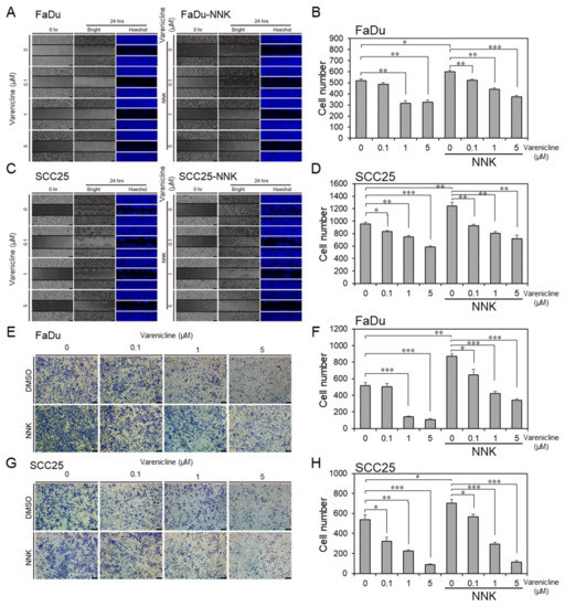 An FDA-approved drug, varenicline, inhibits migration and invasion in NNK-treated cells. Migration ability was measured after 24 h of varenicline treatment at 0.1, 1, and 5 µM in (A,B) FaDu and (C,D) SCC25 cell lines with or without NNK treatments. Invasion ability was measured after 48 h of varenicline treatment at 0.1, 1, and 5 µM in (E,F) FaDu and (G,H) SCC25 cell lines with or without NNK treatments. The experiments were repeated three times, and a two-sided p-value was calculated with Student’s t-test. The error bars indicate the standard error. p-values less than 0.05, 0.01, and 0.001 are denoted by *, **, and ***, respectively.