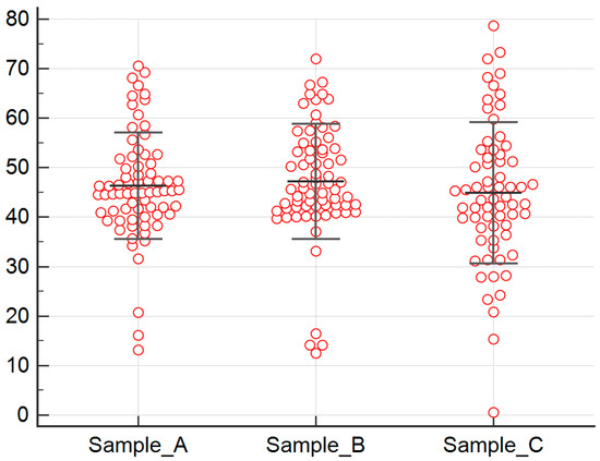 Dot plot of FGF-2 values for blood samples A, B, and C. High inter-patient variability for FGF-2 plasma levels at baseline (sample A), after two weeks (sample B), and at eight weeks (sample C). Blood sample A median FGF-2 serum level was 44.963 pg/mL (range: 13.203–73.618) and mean FGF-2 serum level was 46.355 pg/mL (standard deviation, SD: 11.060). Blood sample B median FGF-2 serum level was 44.919 (range 12.537–72) and mean FGF-2 serum level was 47.103 (SD: 11.763). Similarly, in blood sample C, median FGF-2 serum level was 43.509 (range 0.544–78.735) and mean FGF-2 serum level was 44.582 (SD: 14.141).