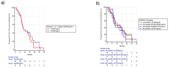 Progression Free Survival (PFS) based on baseline FGF-2 levels. (a) PFS stratified by median FGF-2, median Progression Free Survival (mPFS), respectively, for higher or lower than median: 8.52 vs. 8.60 months, Hazard Ratio (HR): 1.16, 95% Confidence Interval (CI): 0.70–1.92, p = 0.53). (b) PFS stratified in quartiles (first quartile: <40.945 pg/mL, second quartile: 40.945–44.964 pg/mL, third quartile: 44.945–50.819 pg/mL, fourth quartile >50.819 pg/mL), respectively, 10.3 vs. 7.54 vs. 8.52 vs. 8.49 months, p = 0.90.