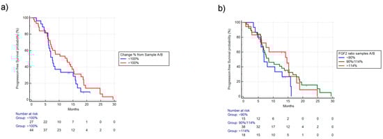 PFS based on ratio of FGF-2 levels between sample A/B. (a) PFS stratified by reduction (<100% concentration of FGF-2 between sample A/B) vs. increase (>100% concentration of FGF-2 between sample A/B). The mPFS for increase vs. reduction was, respectively, 12.85 vs. 7.57 months, HR: 0.73, 95% CI: 0.43–1.27, p = 0.23. (b) PFS stratified by different FGF-2 concentration ratios between sample A/B. The 10th percentile was 80%, the 25th percentile was 90%, the 75th percentile was 114%, and the 90th percentile was 123%. Using the 25th and 75th percentiles, we identified three groups (<90%, 90%–114%, >114% ratio between A/B), mPFS, respectively, was 6.95 vs. 8.49 vs. 14.66 months, p = 0.32.
