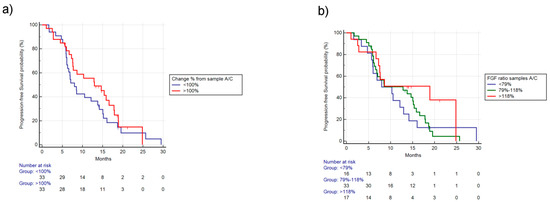 PFS based on ratio of FGF-2 levels between sample A/C. (a) PFS stratified by reduction (<100% concentration of FGF-2 between sample A/C) vs. increase (>100% concentration of FGF-2 between sample A/C). The mPFS for increase vs. reduction was, respectively, 12.98 vs. 8 months, HR: 0.78, 95% CI: 0.46–1.33, p = 0.35. (b) PFS stratified by different FGF-2 concentration ratio between sample A/C. The 10th percentile was 59%, the 25th percentile was 79%, the 75th percentile was 118%, and the 90th percentile was 137%. Using as cutoff the 25th and 75th percentiles, we identified three groups (<79%, 79%–118%, >118% ratio between A/C), mPFS was, respectively, 8.00 vs. 12.85 vs. 18.91 months, p = 0.35.