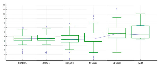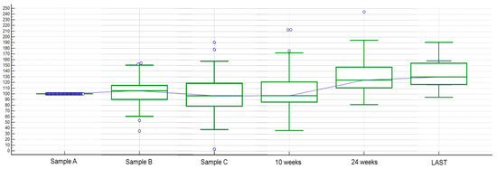 We found a high inter-patient variability for baseline FGF-2 plasma levels. Blood sample A median FGF-2 serum level was 44.963 picograms per millilitre (pg/mL) (range: 13.203–73.618) and mean FGF-2 serum level was 46.355 pg/mL (standard deviation, SD: 11.060). Inter-patient variability was greater for blood sample B, too, with a median FGF-2 serum level of 44.919 (range 12.537–72) and mean FGF-2 serum level of 47.103 (SD: 11.763). Similarly, in blood sample C, FGF2 levels showed high inter-patient variability, median FGF-2 serum level was 43.509 (range 0.544–78.735), and mean FGF2 serum level was 44.582 (SD: 14.141) (Figure 1).