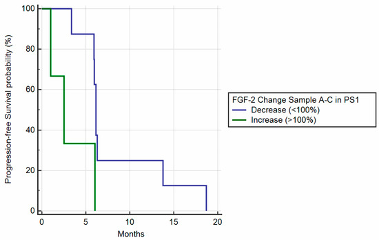 We compared survival outcomes and Response Rate-Disease Control Rate (RR-DCR), stratifying patients on the basis of the reduction (<100% from sample A–B) or the increase (>100% from sample A–B) of FGF-2 levels. An increase was observed in 44 patients (62%) and a reduction in 37 (58%) patients.