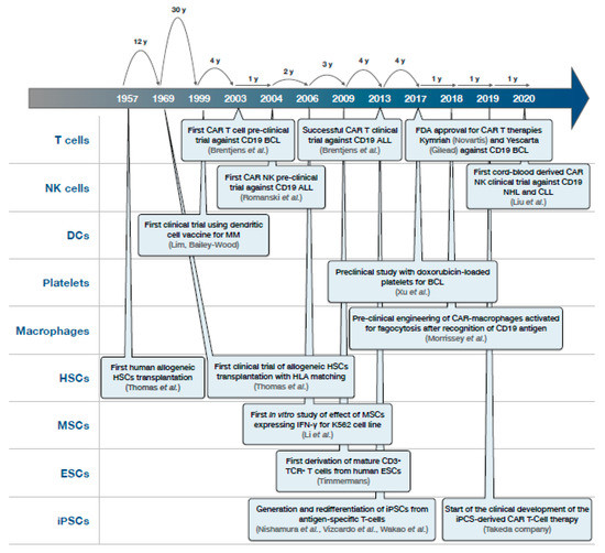 Timeline of cancer cell-based therapy milestones in the past 70 years in blood cancer treatments. ALL: acute lymphoblastic leukemia, BCL: B cell lymphoma, CLL: chronic lymphocytic leukemia, ESCs: embryonic stem cells, NHL: Non-Hodgkin’s lymphoma, MM: multiple myeloma.