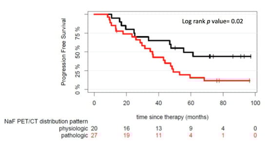 Based on the visual/qualitative evaluation of the whole-body PET/CT scans, we found that patients with a pathologic 18F-NaF PET/CT demonstrated a median PFS of 36.2 months, compared to 55.6 months in the group of patients with a physiologic (negative) 18F-NaF distribution pattern (p = 0.02) (Figure 2).