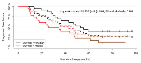 PFS outcome after start of therapy according to SUVmax derived from reference tissue for 18F-NaF and 18F-FDG PET/CT. The patient cohort is dichotomized at the median SUVmax values for 18F-NaF (12.9) and 18F-FDG (3.3).