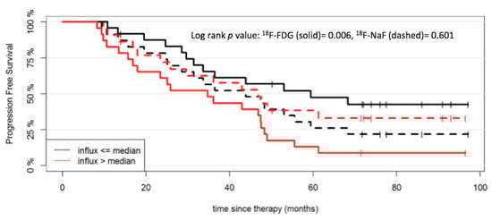 PFS outcome after start of therapy according to influx derived from reference tissue for 18F-NaF and 18F-FDG PET/CT. The patient cohort is dichotomized at the median influx values for 18F-NaF (0.07 mL min−1 mL−1) and 18F-FDG (0.01 mL min−1 mL−1).