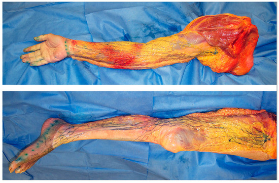 Dissection photos of the superficial lymph-collecting vessels and their corresponding lymph nodes in the upper and lower limbs visualized using the microinjection technique. The lymphatic vessels were injected with blue acrylic dye, and the skin and adipose tissue were removed just above the vessels. Arrows indicate the sentinel node/s of the upper limb (white) and lower limb (black).