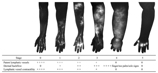 - Yamamoto, T.; Narushima, M.; Doi, K.; Oshima, A.; Ogata, F.; Mihara, M.; Koshima, I.; Mundinger, G.S. Characteristic Indocyanine Green Lymphography Findings in Lower Extremity Lymphedema: The Generation of a Novel Lymphedema Severity Staging System Using Dermal Backflow Patterns. Plast. Reconstr. Surg. 2011, 127, 1979–1986. [Google Scholar] [CrossRef]