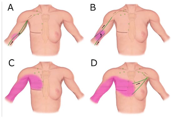 Schematic diagrams show patterns of lymphatic drainage in upper extremity lymphoedema. (A) The ipsilateral axillary region, (B) the clavicular region, (C) the parasternal region, (D) The contralateral axillary region. (Reproduced from [42] with permission.).
