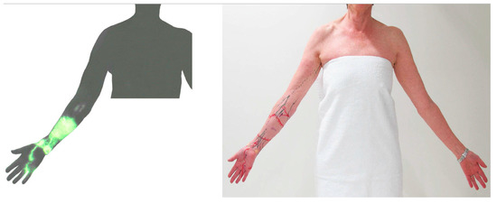 ICG lymphography image (left) and tracing photo (right) in a patient with breast cancer-related lymphoedema. Dermal backflow in the right arm extended to the right front chest and then connected to the left axillary lymph node via the superficial lymph-collecting vessels in the left chest. (Reproduced from [17] with permission).