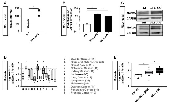 Human CRISPR/Cas9-MLLr model reveals MAT2A as a possible target in MLLr leukemia. (A) RNA sequencing of human CRISPR/Cas9-MLL-AF4 (two different donors, n = 2) compared to the respective controls (ctrl, n = 2, CD34+ huCB cells nucleofected with Cas9 alone and cultured for the same time) revealed upregulated expression of MAT2A. Values in normalized reads per kilobase million (nRPKM), each dot represents a sample. (B) Validation of MAT2A expression was performed by RT-qPCR. MLL-AF4 and MLL-AF9 cells were normalized to culture-expanded CD34+ huCB control cells (ctrl). Experiment was performed in biological duplicates (n = 2) with horizontal bars representing the mean. Error bars indicate standard deviation (SD). One-way ANOVA was used with Dunnett correction: * p < 0.05. (C) Representative Western blot analysis shows increased MAT2A expression in MLLr cells compared to culture expanded CD34+ huCB control cells (factor 1.8 for MLL-AF4 and factor 1.7 for MLL-AF9). Glyceraldehyde-3-phosphate dehydrogenase (GAPDH) was used as the loading control. Blots are cropped and full images are displayed in Figure S1. (D) Upregulated MAT2A expression in leukemic patient samples compared to other cancer types (data from oncomine.org) [19]. Boxes indicate the range from the 25th through 75th percentiles; the horizontal lines represent the median; error bars indicate the range from 10th through 90th percentiles; the dots show the maximum and minimum values. Student’s t test was used: * p < 0.05. (E) MAT2A expression in MLLr leukemia compared to non-MLLr leukemia and healthy controls, respectively (GSE28497, data from oncomine.org) [20]. Boxes indicate the range from 25th through 75th percentiles; the horizontal lines represent the median; error bars indicate the range from 10th through 90th percentiles; the dots show the maximum and minimum values. Mann–Whitney U test was used: * p < 0.05.