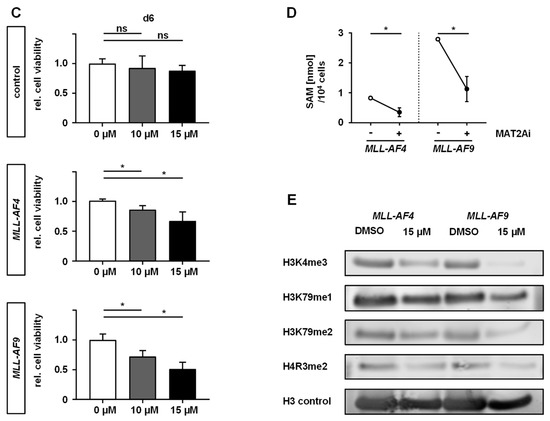 MAT2A inhibition impairs the proliferation and viability of MLLr cells, resulting in reduced SAM levels and histone methylation. (A) MLL-AF4/-AF9 or culture-expanded CD34+ huCB control cells were treated with increasing concentrations of PF-9366 or vehicle (DMSO) for 6 days and the relative cell count was determined by flow cytometry using counting beads. Pooled data of three biological replicates (n = 3) performed in technical triplicates are shown. IC50 values of the dose–response curves were interpolated from a four-parameter logistic model constrained to 0 and 1 in GraphPad Prism. Dots represent the mean. Error bars indicate SD. One-way ANOVA was used with Dunnett correction: *, p < 0.05. (B) Proliferation curves were assessed by treating the indicated cells with PF-9366 (10, 15 µM) or control (DMSO) and counting cells following Trypan blue staining every second day. The mean of pooled data of three biological replicates (n = 3) performed in technical triplicates is shown. Dots represent the mean. Error bars indicate SD. One-way ANOVA was used with Dunnett correction: *, p < 0.05. (C) Cell viability of MLLr and control cells upon inhibition treatment with PF-9366 (10, 15 µM) or control (DMSO) was determined after 6 days by fluorescence-based read of alamarBlue assay. Experiment was performed in three biological replicates (n = 3) and technical triplicates. Bars represent the mean. Error bars indicate SD. One-way ANOVA was used with Dunnett correction: *, p < 0.05. (D) MLLr cells were treated with 15 µM PF-9366 or DMSO as a control for 6 days. Intracellular SAM levels of 104 cells were quantified by fluorescence-based Bridge-It Assay Platform Technology using a SAM standard curve. Results of two independent experiments (n = 2) are displayed. Student’s t-test was used: *, p < 0.05. (E) Western blot analyses of extracted histones from MLLr cells treated with 15 µM or DMSO as the control for 6 days are displayed showing decreased global methylation of H3K4me3, H3K79me1, H3K79me2, and H4R3me2. Blots are cropped and full images are displayed in Figure S4.