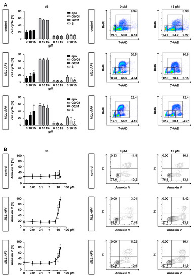 Inhibition of MAT2A reduces DNA synthesis and induces apoptosis of MLLr cells. MLL-AF4/-AF9 or culture-expanded CD34+ huCB control cells were treated with PF-9366 (10 or 15 µM) or vehicle (DMSO) for 6 days. (A) Pooled data (left) and representative (right) cell cycle analyses of single cells from three biological replicates (n = 3) performed in technical triplicates are shown. Data were acquired using BrdU staining and flow cytometry. Bars represent the mean. Error bars indicate SD. One-way ANOVA was used with Dunnett correction: *, p < 0.05. (B) Annexin V staining revealed translocation of phosphatidylserine to the outer leaflet of the plasma membrane in apoptotic cells. Pooled (left) and representative (right) data from three biological replicates (n = 3) performed in technical triplicates are shown. Dots represent the mean. Error bars indicate SD. One-way ANOVA was used with Dunnett correction: *, p < 0.05.