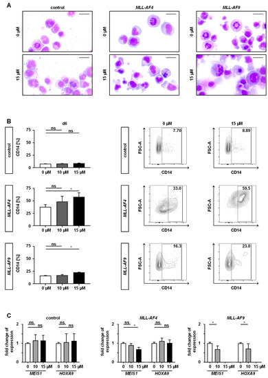 One specific characteristic of MLLr leukemia is the expression of elevated target genes, hereby preserving immaturity [21,22,23]. Therefore, we investigated the expression of MLLr target genes and differentiation upon inhibition with PF-9366. For maturation analysis, we performed May-Gruenwald-Giemsa staining to evaluate cell morphology and additionally determined CD14 as a marker of differentiation by flow cytometry following 6 days of PF-9366 treatment. Untreated (DMSO control) CRISPR/Cas9-MLLr cells presented an immature morphology whereas treatment with PF-9366 resulted in macrophage-like cells with an increase of apoptotic cells consistent with the upregulation of CD14 expression (Figure 4A,B). Consistently, a trend to downregulate the target gene expression of MEIS1 and HOXA9 upon PF-9366 treatment was observed, irrespective of day 4 or 6, although significance was not reached in all performed experiments (Figure 4C). These data suggest that the inhibition of MAT2A results in cell differentiation, induction of cell cycle arrest, and finally apoptosis in MLL fusion protein-driven leukemogenesis without any impact on control cells.