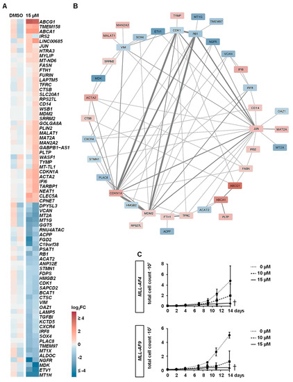 Downstream effects of MAT2A inhibition on gene expression. (A) MLL-AF4 cells were treated with 15 µM of PF-9366 or vehicle (DMSO) for 4 days and two biological replicates (n = 2) were used for RNA-seq. DEGs are displayed with 38 genes upregulated and 36 genes downregulated. The interactome of all DEGs is shown in (B) with the main effect of MAT2A inhibition on cell cycle progression notable by the interacting genes CDKN1A/p21, CDK1, RB1, and MDM2. (C) For long-term experiments, MLL-AF4/-AF9 cells were treated with 10 or 15 µM of PF-9366 or vehicle (DMSO) for a minimum of 2 weeks. Stable inhibition of proliferation is shown by two biological replicates (n = 2) performed in technical triplicates.