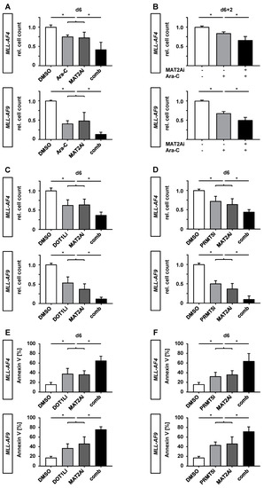 PF-9366 sensitizes MLLr cells to chemotherapy and acts synergistically in combination with targeted therapies. (A) MLL-AF4/-AF9 cells were treated with 10 nM cytarabine (Ara-C) and 10 µM PF-9366 (MAT2Ai) simultaneously for 6 days. Single treatments or vehicle (DMSO) were used as controls, respectively. Experiment was performed in three biological replicates (n = 3) and technical triplicates. (B) Initial treatment with PF-9366 (MAT2Ai +) or vehicle (MAT2Ai −, DMSO) for 6 days was washed out and cells were reseeded with 10 nM cytarabine (Ara-C +) or vehicle (Ara-C −, PBS) and monitored for 2 days (6 + 2). Experiment was performed in three biological replicates (n = 3) and technical triplicates. Relative cell count was determined by flow cytometry using counting beads. (C,D) MLL-AF4/-AF9 cells were treated with either 1 µM EPZ004777 (DOT1Li), 1 µM EPZ015666 (PRMT5i), or 10 µM PF-9366 (MAT2Ai), in respective combinations or vehicle (DMSO) for 6 days. Relative cell count was analyzed by flow cytometry using counting beads. Pooled data of three biological replicates (n = 3) performed in technical triplicates are shown. (E,F) Annexin V staining revealed apoptotic cells in MLL-AF4/-AF9 cells treated with the indicated compounds for 6 days. Experiment was performed in three biological replicates (n = 3) and technical triplicates. Data were acquired using flow cytometry. Bars represent the mean. Error bars indicate SD. One-way ANOVA was used with Sidak correction: *, p < 0.05.