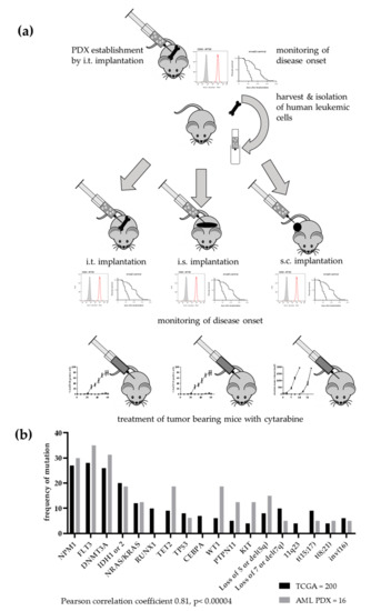 Establishment of a patient-derived xenograft panel of 20 acute leukaemia models. (a) Implantation scheme over several passages. Patient blasts were implanted into the bone marrow of NSG mice. When disease onset was observed by detection of human cells in peripheral blood and deterioration of overall condition, mice were sacrificed and cells from bone marrow and spleen harvested. After a mouse cell depletion human leukaemic cells were re-implanted into the bone marrow of recipient mice. This procedure was repeated until stable growth was observed. Subsequently, the PDX leukaemic cells were implanted into the bone marrow, in the spleen or subcutaneously into NSG mice. The monitoring of disease onset was performed as described before. Additionally, the antitumoral activity of cytarabine was evaluated in all three settings in four different PDX models. (b) For 16 models, mutational data were available. The comparison with TCGA data revealed a highly significant correlation between the two data sets. Mutational data were either acquired based on WES or RNAseq.