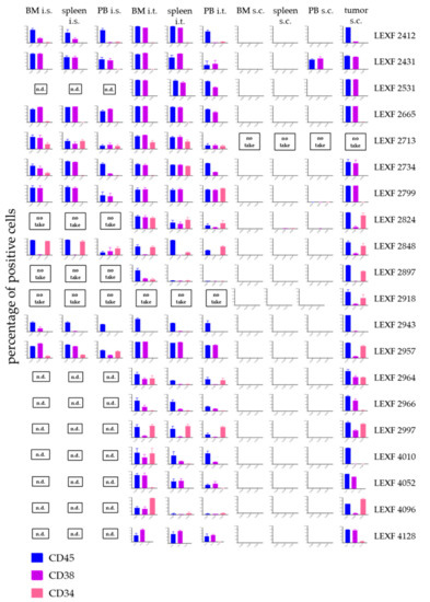 Infiltration pattern of 20 leukaemia PDX in bone marrow, spleen and peripheral blood depending on the injection site of the leukaemic cells. Each PDX model displayed its specific expression pattern of the three investigated surface markers CD45, CD38 and CD34 in all tested settings. Despite for one model, LEXF 2431, leukaemic cells did not infiltrate the haemopoietic organs when injected subcutaneously. A no take was defined by no growth after three individual experiments with n > 3 mice and an observation time > 2-fold of the passaging time of the individual model. n.d., not determined.